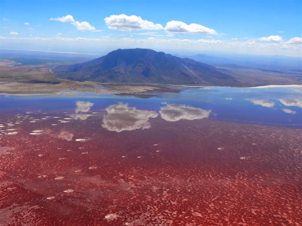 El Lago Natrón, se encuentra en el valle del Rift, en Tanzania. Es un lago salado endorréico, lo que quiere decir que no filtra ni elimina el agua que recibe más que por evaporación en su superficie. De sus profundidades, surgen espirales de carbonato sódico a través de géiseres, que dejan en sus orillas una espuma blanca. Sus aguas se tiñen de rojo debido a las algas. En ocasiones sus aguas se tiñen de rojo debido a las algas. Solo una especie de peces puede vivir en sus aguas, el alcolapia alcalica. Aunque el paisaje que lo rodea, como el volcán Ol Doinyo Lengai, al sur, es espectacular, es un lugar de difícil acceso, habitado por los masai. En cambio, es muy visitado por los flamencos, que filtran el agua con su pico.