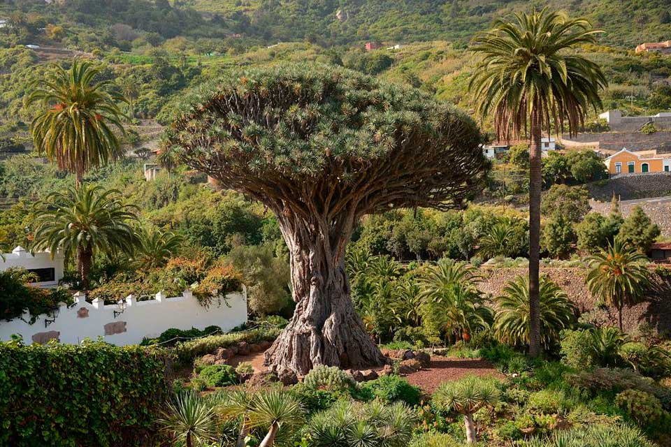 Este es el famoso Drago Milenario de Icod de los Vinos en el Norte de Tenerife. Mide 18 m de altura. y el perímetro del tronco mide 20 m. Tiene 300 ramas principales y es el más longevo que se conoce del mundo. Es difícil establecer su edad con precisión, que según unos es de 700 años, de los que hay constancia, y según otros de 3000, según las ramas.
