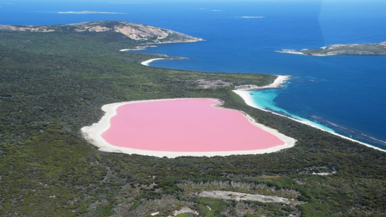 El lago Hillier está situado en la isla Middle, la mayor isla del archipiélago de la Recherche, en Australia Occidental. Mide unos 600 m de largo , y 200 m de ancho y está rodeado de arena y eucaliptos. Su color rosa no cambia. Se especula con la combinación de Dunaliella salina y la halo-bacteria, algas y microorganismos que proliferan en ámbitos altamente saturados de sal y producen un pigmento, una proteína, la bacterioruberina, para absorber luz solar y realizar la fotosíntesis.