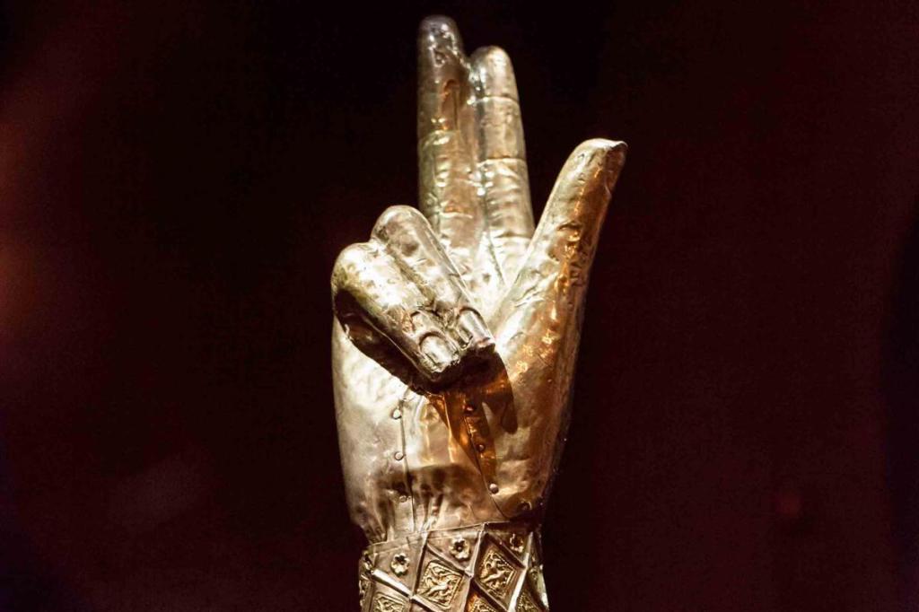 Otro de los relicarios guardados en Conques es el que, según dice la tradición, guarda el brazo de San Jorge con el que mató al dragón.