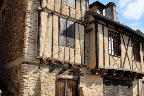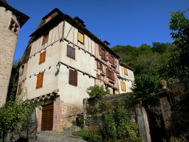 Detalle de la construcción típica de Conques, con piedra y madera. Las casas tienen orientadas sus fachadas principales hacia la región del mediodía-pirineos y tienen dos entradas. Las de las plantas bajas, abiertas hacia la calle inferior, y las de la primera planta, abiertas hacia un jardín o hacia la calle superior. Según un dicho local: «En Conques, se entra por el granero para salir por el sótano». Los cimientos se hallan excavados en la roca.