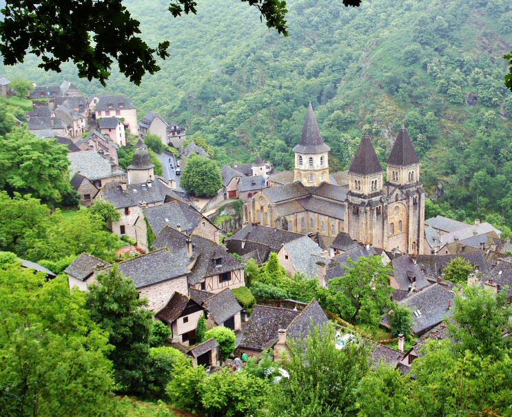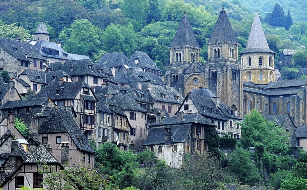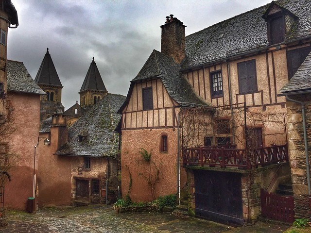 Situada en el departamento de Aveyron, en la Occitania francesa, junto al río L´Ouche, una zona en la que todavía los mayores hablan occitano (ellos dicen Concas) y que muchos consideran el pueblo más bonito de Francia. Parece ser que era parada obligatoria en el Camino de Santiago, ya que se conservaba una reliquia de la mártir Sainte Foy, que defendió su fe cristiana contra los romanos en el siglo IV. En el siglo XI se construyó la Abadía de Santa Fe , una de las grandes joyas del Románico francés, con nave central y dos laterales y que alcanza una altura de veinte metros. A su alrededor se levantó un pueblo donde todo parece regirse por las mismas normas medievales con las que se levantó. Las casas, construidas con vigas de madera, han resistido el paso de los siglos. Durante la Revolución Francesa, los habitantes de Conques escondieron en sus casas el famoso tesoro de la abadía, objetos finamente tallados con oro, plata y piedras preciosas durante los tiempos de Carlomagno y Pipino II de Aquitania. Aunque la reliquia con mayúsculas era la que venían a adorar los peregrinos en su largo viaje a Santiago, la gran estatua de oro de Santa Fe.