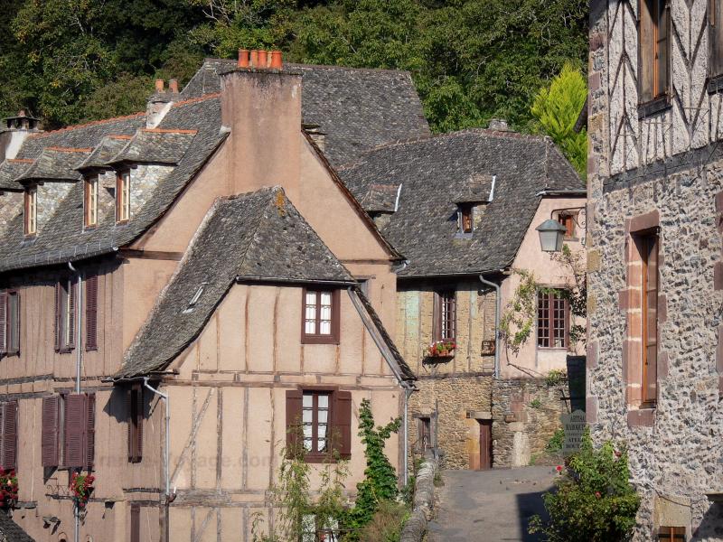 Una de las calles y casas de Conques, construidas con piedra, vigas de madera y tejados de pizarra.