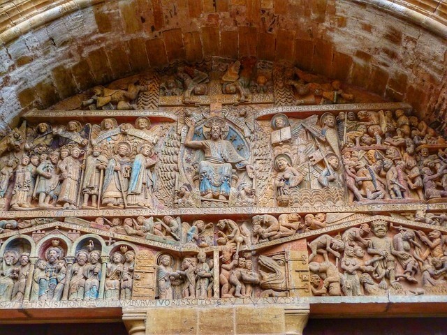 Tímpano de la puerta oeste de la abadía, del siglo XII, enmarcado con arquivolta de medio punto, decorado con más de 120 personajes, que representan el Juicio Final y policromado en dos colores, en azul el cielo, y en rojo el infierno. En la parte superior aparecen los ángeles tocando la trompa. En el nivel central, Cristo en majestad, en el centro, que preside el juicio a las almas, y detrás de Él, los ángeles llevan la Cruz. El arcángel San Miguel y un demonio pesan las almas. Los justos pasan a la derecha de Cristo y los condenados a la izquierda, donde los come un Leviatán. La Virgen María y San Pedro aparecen en una aureola a la derecha de Cristo. También aparece Abraham recibiendo a los justos y Santa Fé, de rodillas. Abajo a la derecha, aparece Satanás y los pecados capitales.