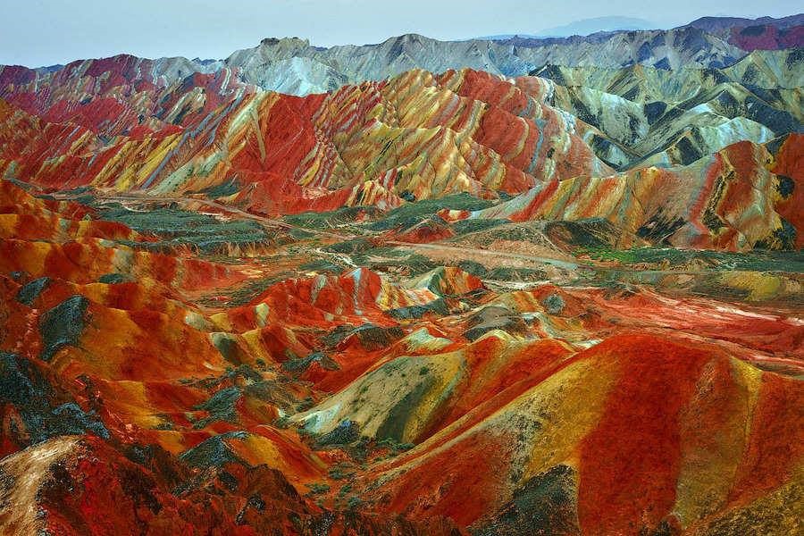 Estas montañas son parte del parque geológico Zhangye Danxia en la provincia china de Gansu, al noroeste del país. Es una zona climatológica de escasas lluvias que comparte con el desierto del Gobi. Tiene unos 500 kilómetros cuadrados de superficie. Hay plataformas y miradores por todo el recorrido. Aunque cada año hay más visitantes, aún se puede visitar con tranquilidad.