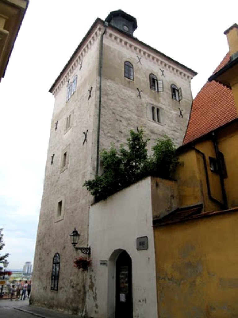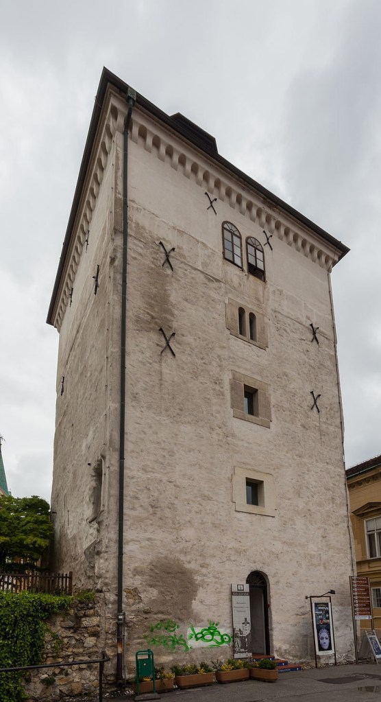 La torre Lotrščak, de mediados del siglo XIII. Cuenta la leyenda que un tiro de cañón disparado desde la torre cruzó el río Sava y aterrizó en el campamento turco que les asediaba. Justamente sobre el plato de pollo que le llevaban al Pacha para comer.