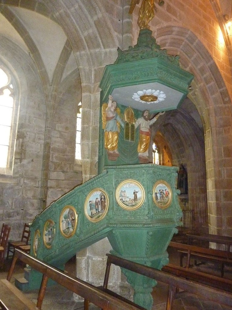 Púlpito de la Iglesia de San Ronan, con medallones circulares decorados con bajorrelieves.
