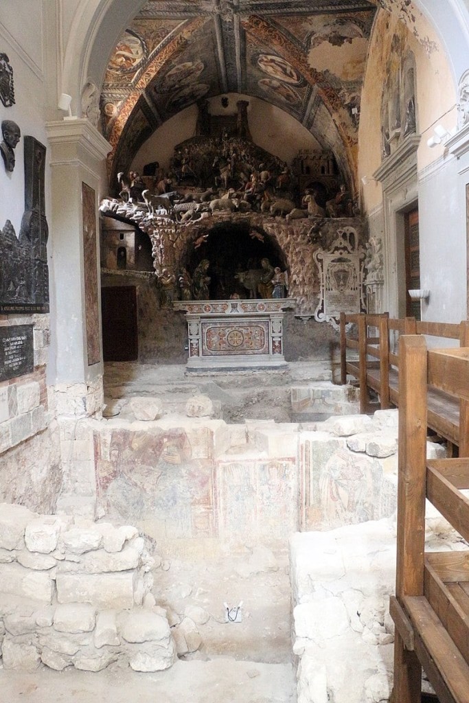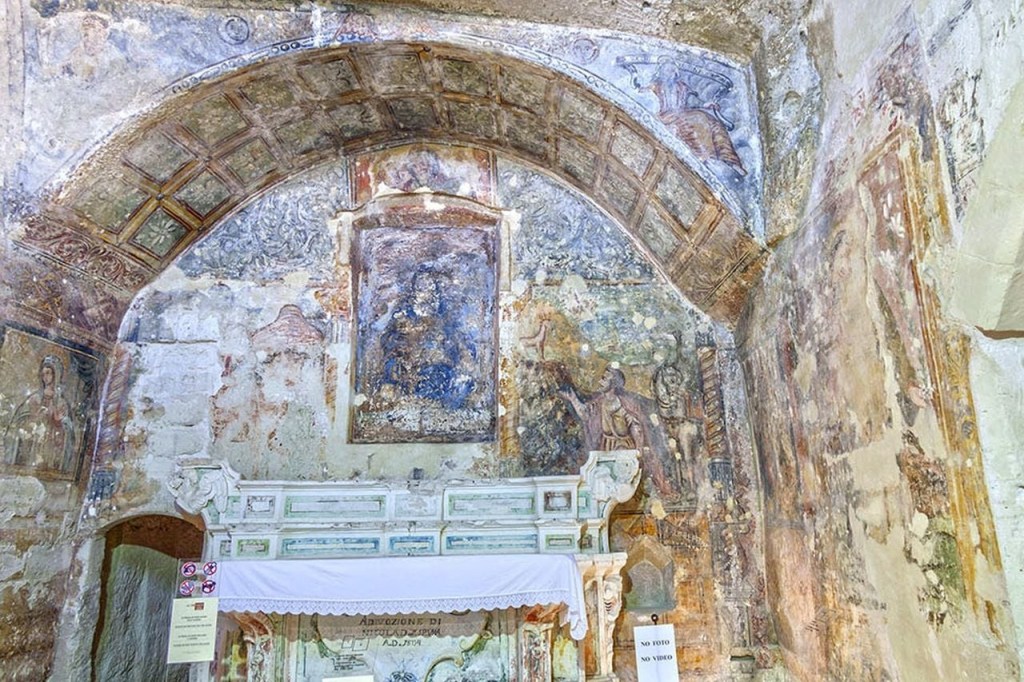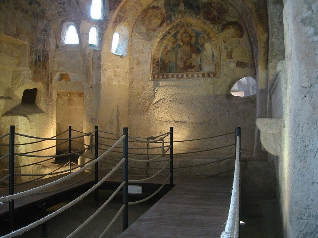 En el exterior de la ciudad, en campo abierto, está la Cripta del Peccato Originale, recientemente restaurada , con un extraordinario ciclo pictórico de frescos que cubren las paredes de la izquierda y del fondo.