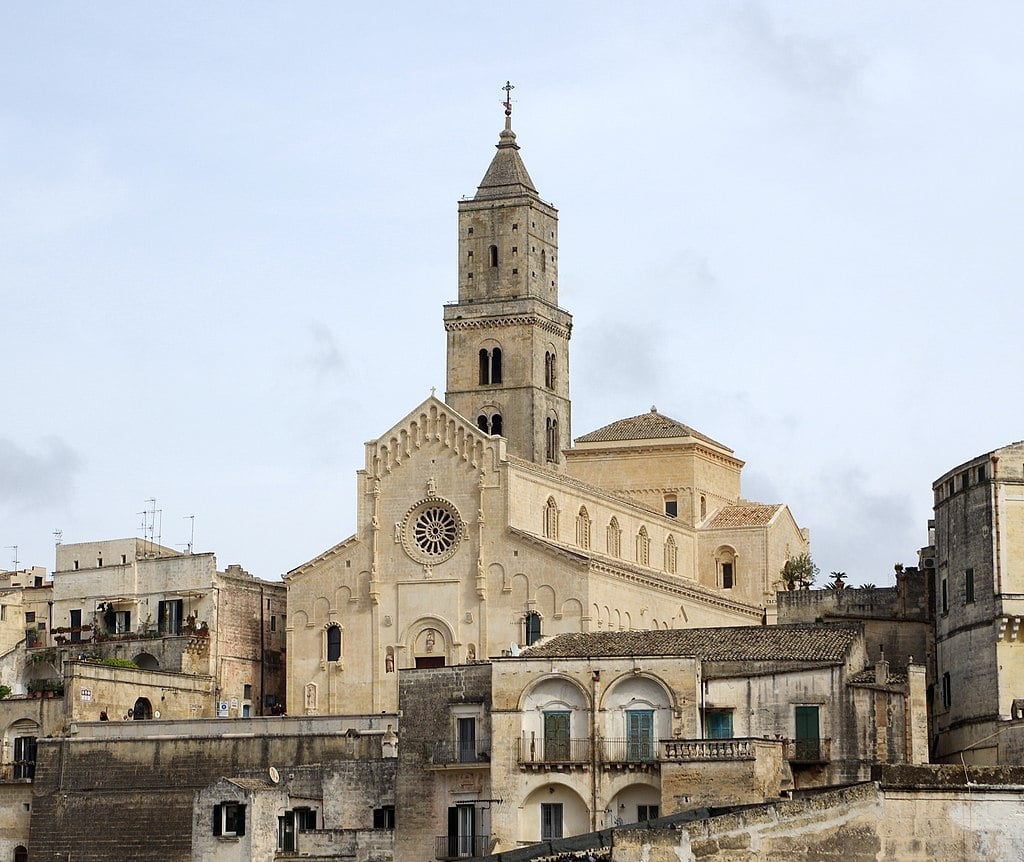 La catedral , del siglo XIII, dedicada a Santa Maria della Bruna. Erigido en estilo arquitectónico románico apuliano, la iglesia tiene un alto campanario de 52 metros. Construida sobre una espuela en lo más alto de la ciudad que divide los dos sassi.