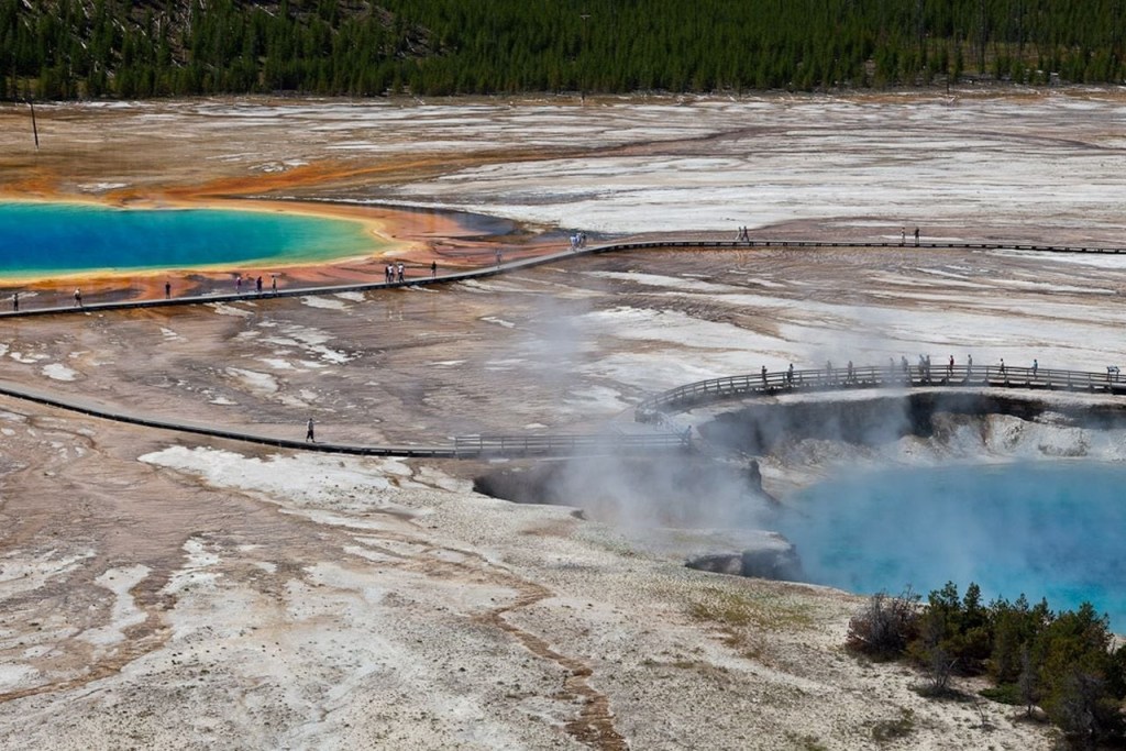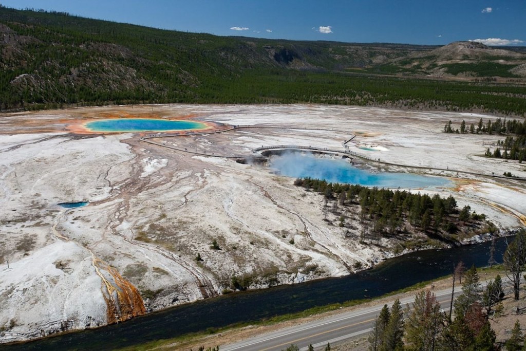 El Grand Prismatic Spring y el Excelsior Geyser desde el aire.