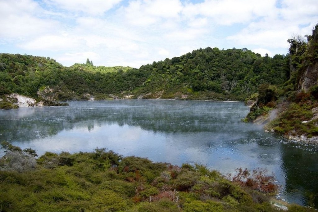 Frying Pan Lake es la fuente termal más grande del mundo. Se encuentra en el Echo Crater del Valle del Rift Volcánico Waimangu, en el norte de Nueva Zelanda, y su agua ácida mantiene una temperatura de aproximadamente 50-60 ° C. La profundidad media es de 6 m. El lago nació de una gran erupción volcánica en 1886, cuando entró en erupción el Monte Tarawera, Después de quince años, El géiser más grande del mundo, el géiser Waimangu, estuvo soltando agua a una altura de 40 metros durante cuatro años. Luego, se fueron conformando el aspecto y tamaño actuales.