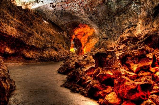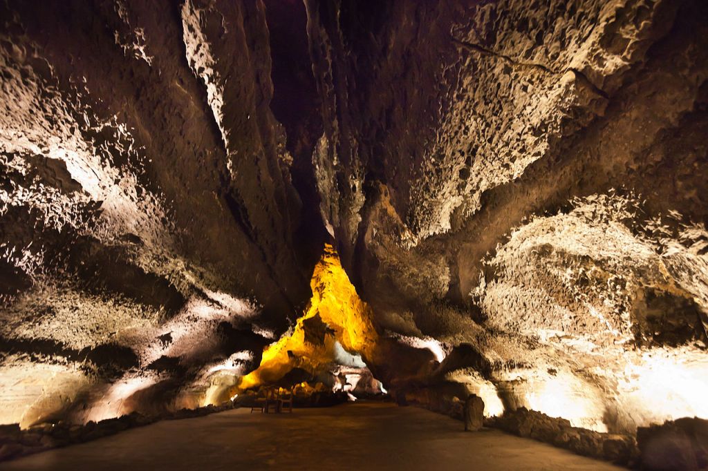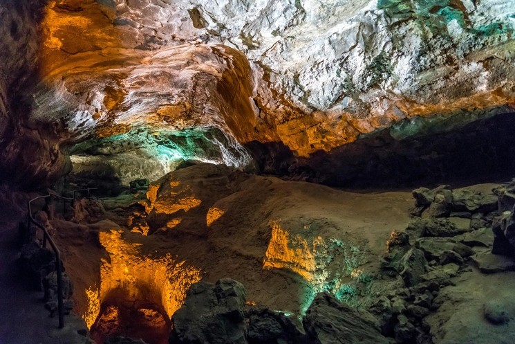 La Cueva de los Verdes, en Lanzarote, Canarias, cerca de Haría, es un tubo volcánico producido por la erupción del Volcán de la Corona hace más o menos unos 20.000 años. Por él, se desplazaba la lava incandescente, que, al enfriarse, dejó un túnel de unos 50 m. de alto y unos 7 Km. de longitud, hace unos 5000 años. A lo largo de su recorrido existen al menos dieciséis Jameos, que se prolongan desde el cráter del volcán, hasta que se adentra en el mar en un tramo submarino de un kilómetro y medio, que se conoce como El Túnel de la Atlántida. Fue iluminada por Jesús Soto, colaborador de César Manrique, resaltando los verdes naturales y otras maravillosas tonalidades. Hay también un espacio para conciertos, gracias a su espectacular sonoridad.