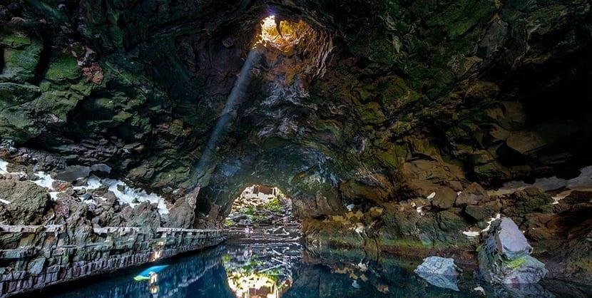Uno de los jameos. Aquí se aprecia muy bien el musgo color verde que da nombre a la cueva.