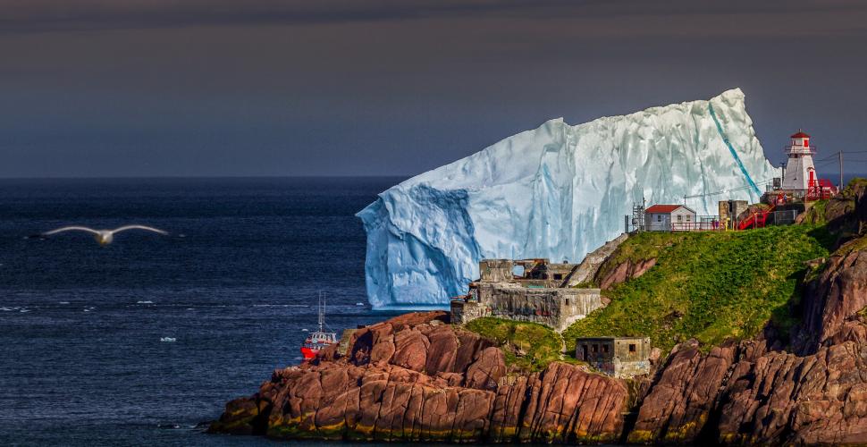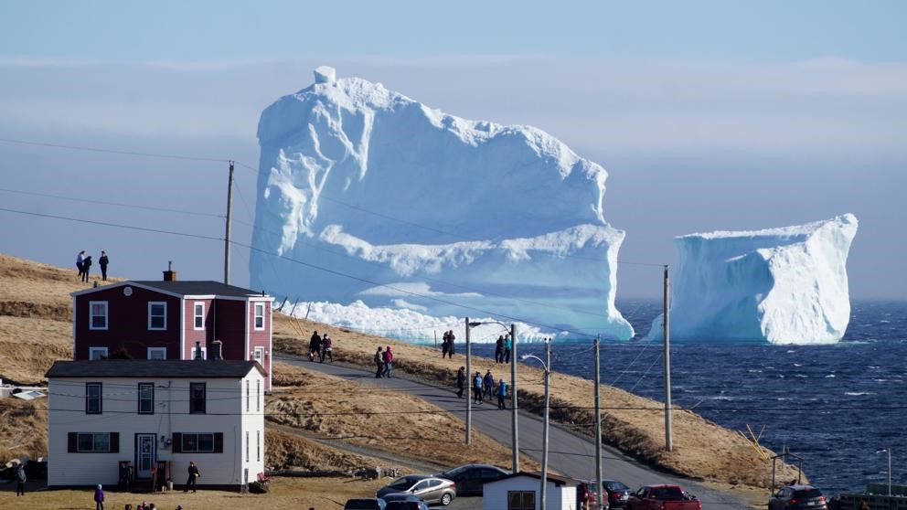 Los icebergs representan un gran peligro para los barcos, y todos recordamos cuando uno hundió Titanic. Este desastre llevó a la zona a ser apodada «Iceberg Alley». Los llamados cazadores de icebergs controlan el movimiento de éstos cuidadosamente. Hay que recordar que un iceberg solo muestra el 10% de su tamaño y que el 90% va debajo del agua y que tarda en formarse unos 10.000 años o más. La época buena para ver el desplazamiento de los icebergs es durante los meses de mayo y junio, aunque se puede alargar hasta agosto. Dependiendo de los años el número puede oscilar de 400 a 2.200, en el año 1984.También se pueden ver ballenas.