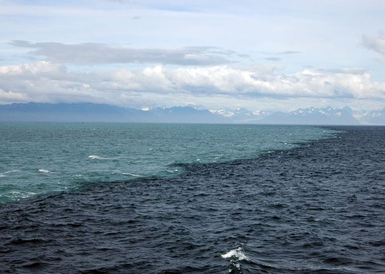 En el Golfo de Alaska, confluyen aguas que proceden del deshielo de glaciares, más claras de color, con las más salinas del Pacífico.