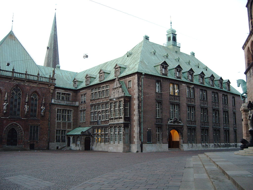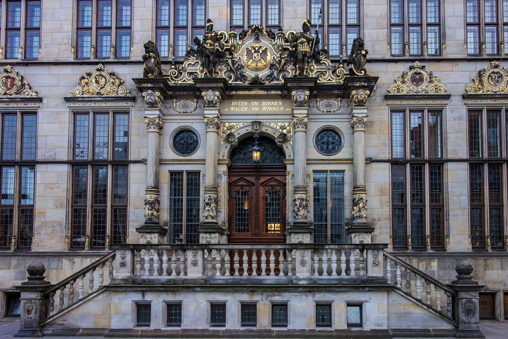 La puerta principal del Ayuntamiento es la que se ve iluminada. Hay varias residencias dentro del Ayuntamiento, entre ellas, la del alcalde de Bremen.