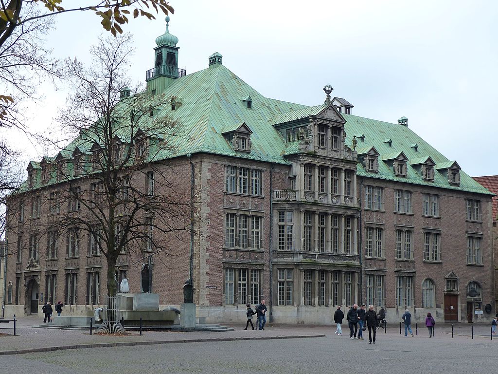 Fachada lateral del Ayuntamiento, Rathaus, con una feliz combinación de lo viejo y lo nuevo, mezclando estilos de ladrillo con arquitectura renacentista, piedra caliza de concha y tejados cobrizos.