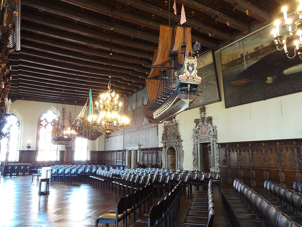 Interior del gran salón del Ayuntamiento. Del techo de madera, penden maquetas de barcos históricos. Las puertas renacentistas y barrocas se conservaron cuando de reconstruyó el edificio a principios del siglo XX.