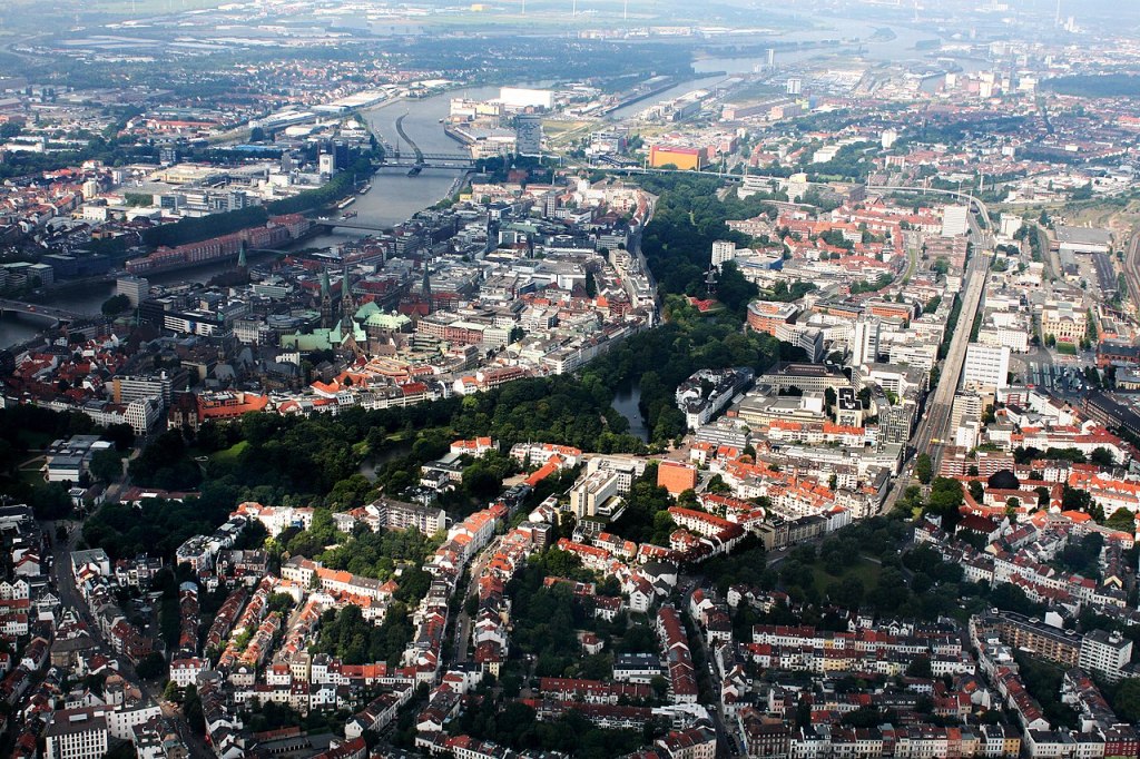 Vista aérea de la ciudad de Bremen. En el centro, hacia la izquierda se pueden ver las torres y tejados cobrizos de la Catedral, el Ayuntamiento y edificios de la Marketplatz.