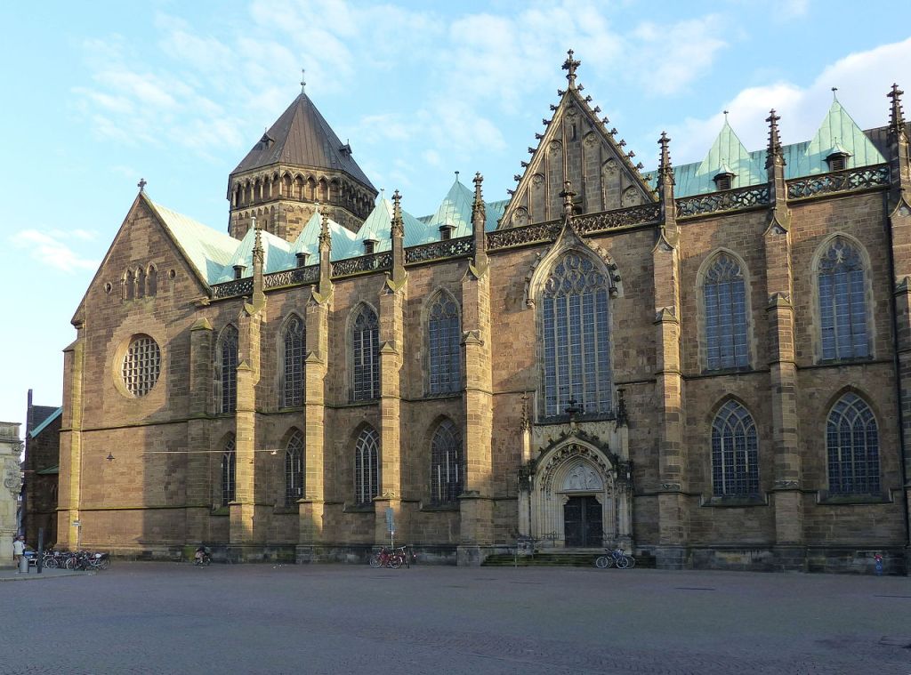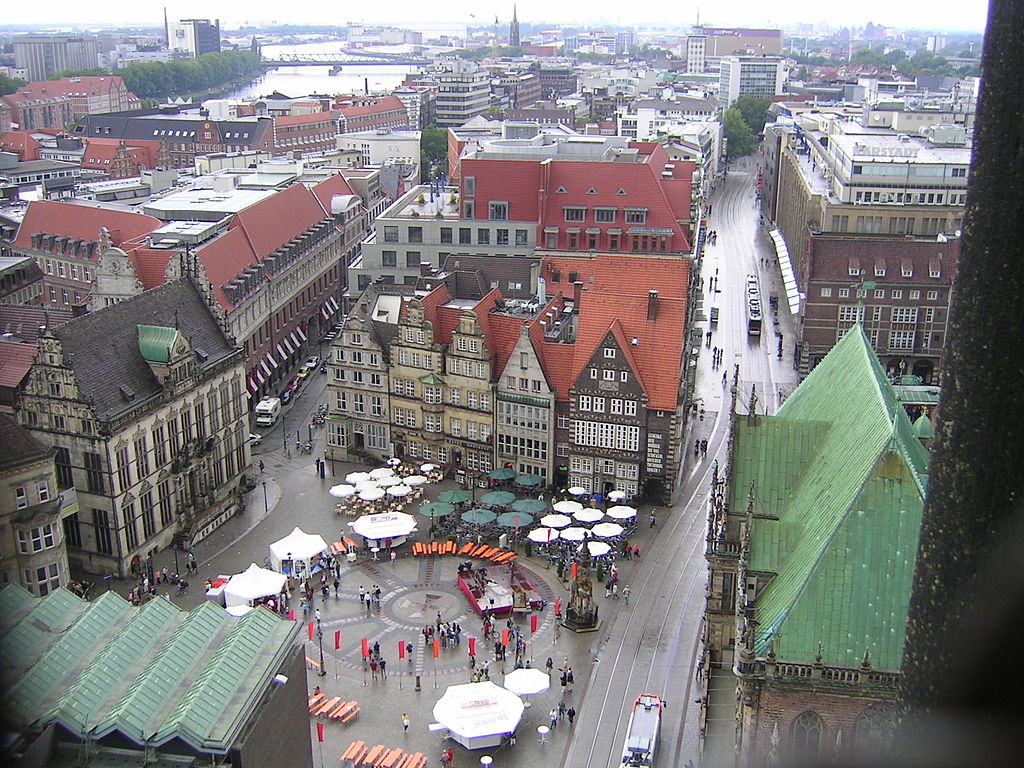 Vista de Marketplatz desde la torre de la Catedral. En primer término, a la derecha, el tejado del Ayuntamiento. A la izquierda, se ve el tejado del Parlamento. A la izquierda, en el centro , el edificio de Schütting. De frente las casas de los comerciantes.