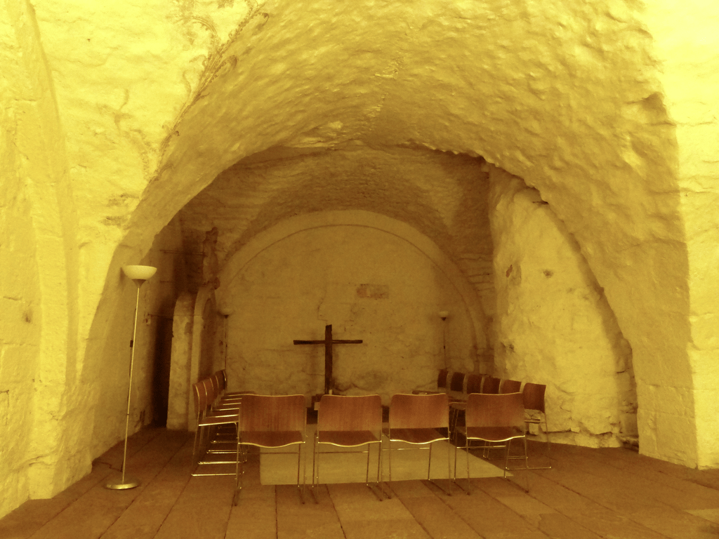 Una de las criptas Románicas originales que se conserva. En el centro, la Pila Bautismal Románica y en el frente, un relieve de Cristo Rey.
