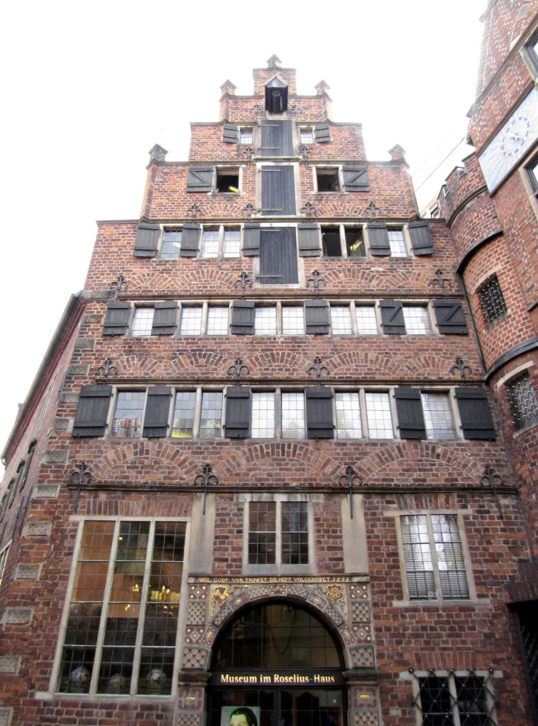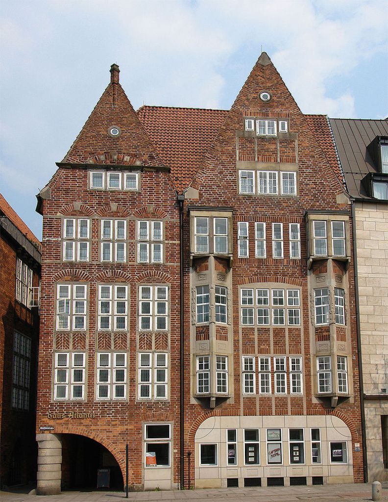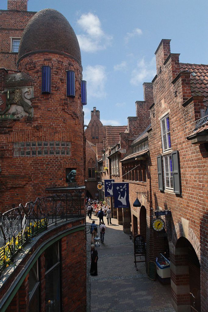 Böttcherstraße. Calle de los toneleros. La calle, que ya en la Edad Media servía de comunicación entre la Marketplatz y el río, y sus edificios, levantados muchos entre 1920 y 1930 por iniciativa del simpatizante nazi Ludwig Roselius, un comerciante de café de Bremen, son un raro ejemplo de una arquitectura que pertenece a una variante del estilo expresionista. El estilo de muchas de las casas puede clasificarse como Expresionismo en ladrillo.