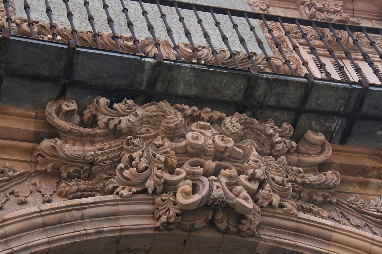 Imagen nocturna de la Plaza Mayor de Salamanca, y detalle del trabajo de piedra rosada de Villamayor labrada, sobre el arco de San Fernando.