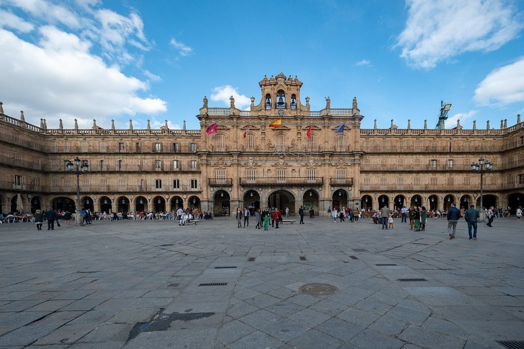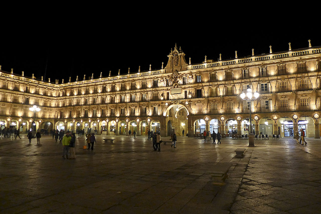 Sin lugar a dudas, la más bonita y grande de todas las plazas de España. Edificada con piedra de Villamayor, entre el año 1729 y el 1756, en estilo barroco. Fue el arquitecto Alberto Churriguera, quien diseñó el pabellón Real y el de San Martín y posteriormente continuada por otros arquitectos, como Andrés García de Quiñones, con pocas modificaciones respecto al proyecto inicial. Como curiosidad, hay que decir que no es totalmente cuadrada. Ninguno de sus lados mide lo mismo. Hasta mediados del siglo XX, tenía jardines y un templete central para música.