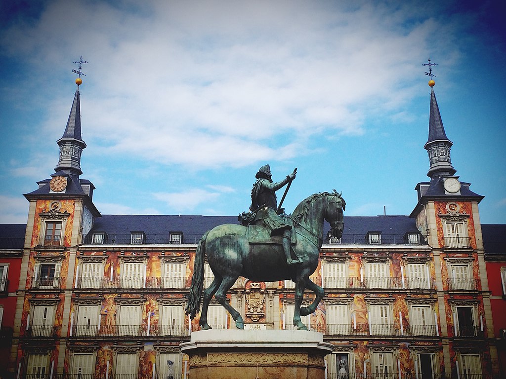 Casa de la Panadería, la casa más antigua de la Plaza, y delante, en el centro de la misma, la estatua ecuestre en bronce de Felipe III, obra de Juan de Bolonia y Pietro Tacca.