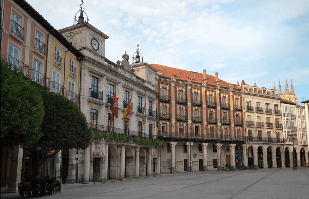 Plaza Mayor de Burgos, porticada la mayor parte, con el Ayuntamiento a la izquierda, sobre los arcos de la Puerta de las Carretas que da salida al Paseo del Espolón. Al fondo se ven las agujas del cimborrio de la Catedral de Santa María.