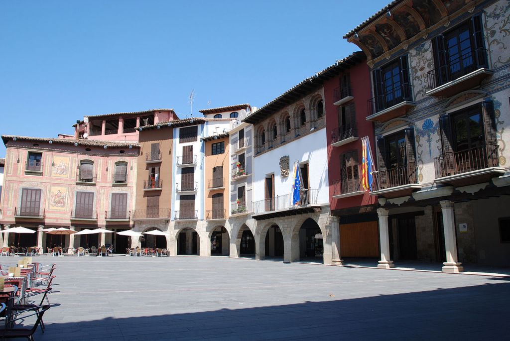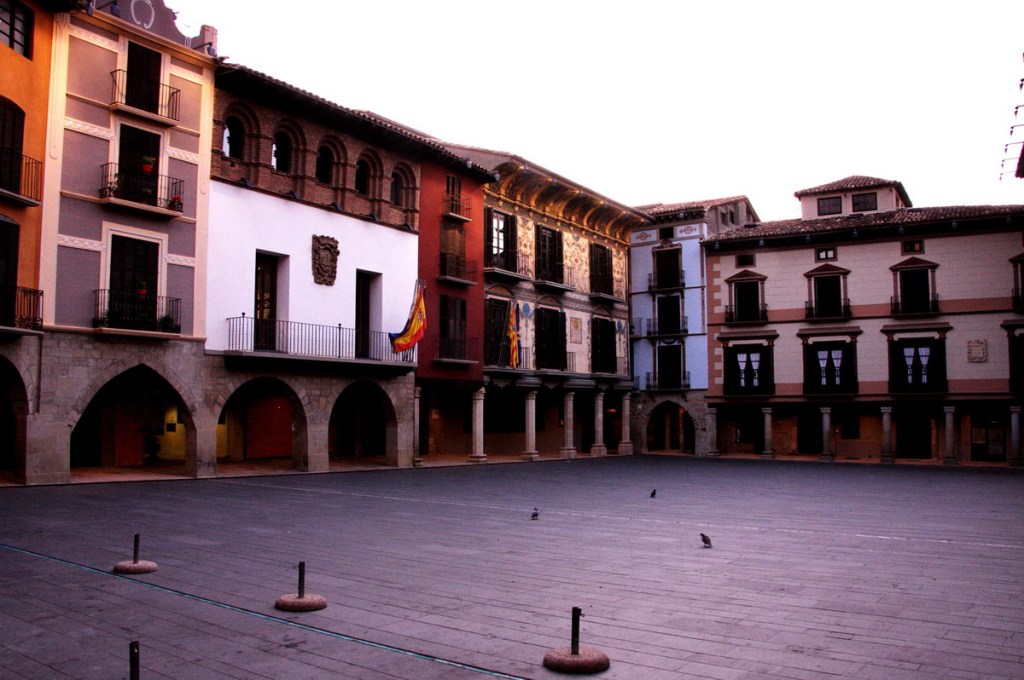Se considera la capital de Sobrarbe, en Huesca. De origen medieval, se cree que del XII o XIII, conserva perfectamente los edificios originales. Es de planta trapezoidal y sus elementos más característicos son su arcos de medio punto y ojivales, todos diferentes que se suceden para cubrir los soportales. A ambos lados, se conservan dos prensas comunales para hacer vino.
