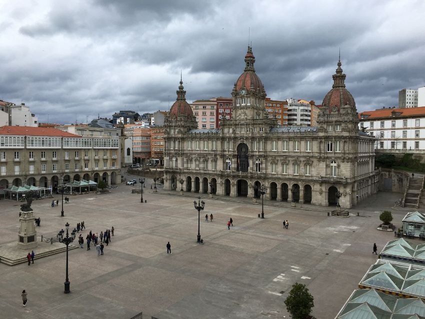 Es la Plaza Mayor de La Coruña. La plaza forma un gran rectángulo . En una de sus frentes se encuentra el Ayuntamiento, situado en el Palacio de María Pita, construido por Pedro Mariño Ortega en 1904, rodeado por las otras tres partes por edificios porticados y culminados con unas espléndidas galerías, típicas de la arquitectura gallega. En el centro de la plaza, la estatua de María Pita, defensora de la ciudad frente a los ataques ingleses en el siglo XVI. En el exterior de los soportales hay terrazas cerradas y acristaladas, que guardan la apariencia uniforme.