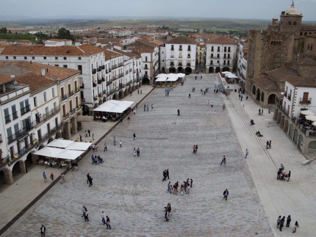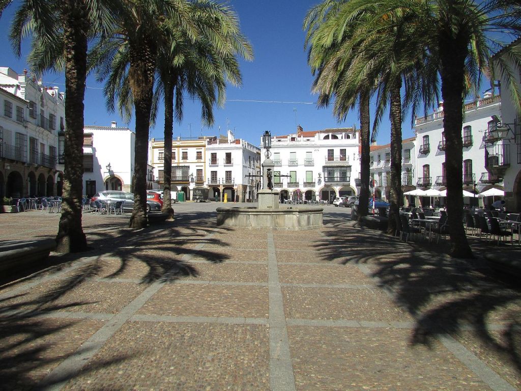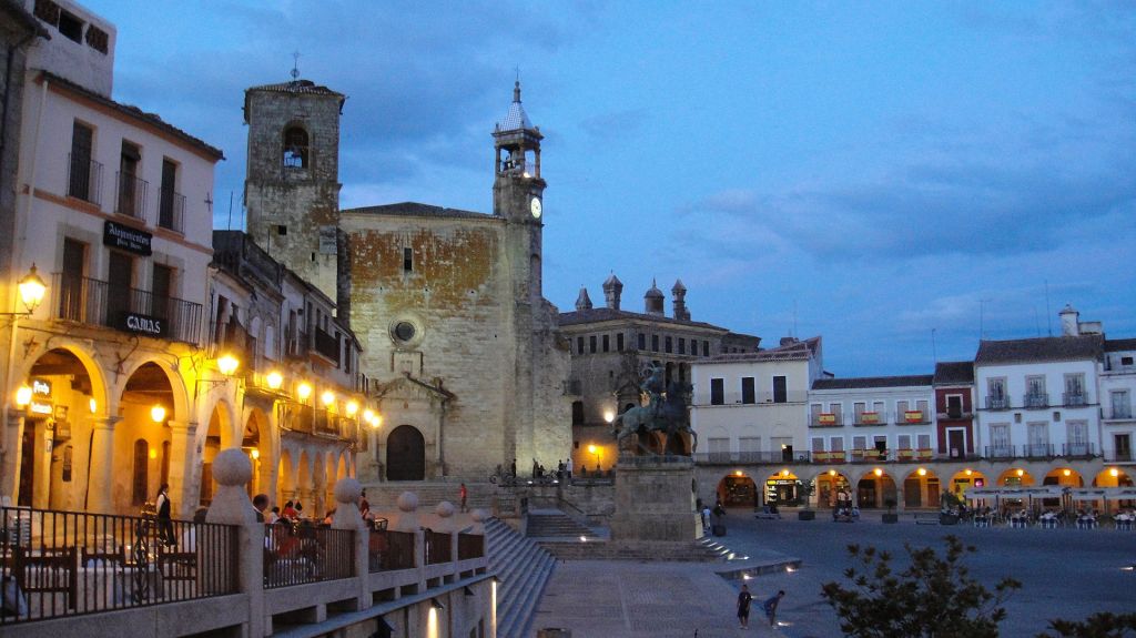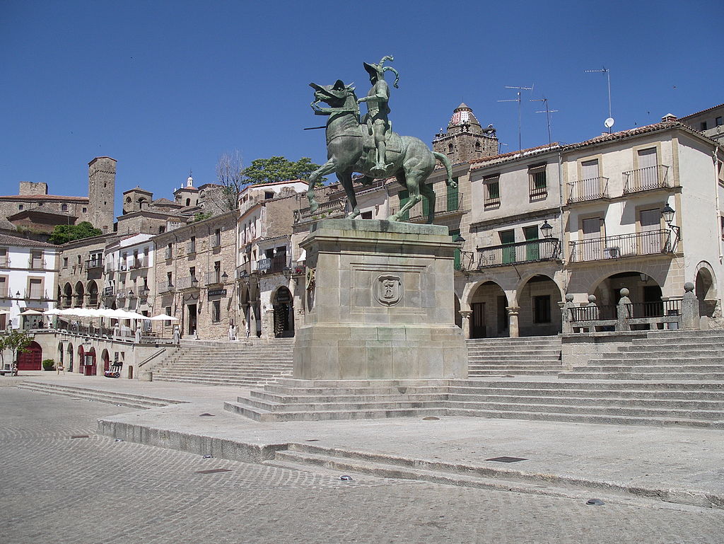 Tras un primer asentamiento celta, Trujillo, en la provincia de Cáceres, creció a la sombra de su alcazaba musulmana. La plaza es una de las más bonitas de España, donde, a partir del siglo XIV empezaron a construirse casas con soportales, y más tarde, algunos nobles tras su regreso de América durante el siglo XVI, construyeron edificios palaciegos renacentistas. Preside la Plaza la Iglesia de San Martín de Tours, el Palacio de la Conquista y la Casa de las Cadenas. Otro de los edificios más importantes es el palacio de los Vargas-Carvajal o de San Carlos, que se identifica por el característico extremeño balcón y la magnifica portada, también podemos ver el Palacio de Piedras Albas, coronado por una crestería gótica. Pero la joya es el Palacio de la Conquista. Tiene una rica decoración plateresca que asciende enmarcando el balcón de la esquina y el escudo que Carlos V concedió al descubridor. En el centro de la plaza se alza la estatua ecuestre de Francisco Pizarro.
