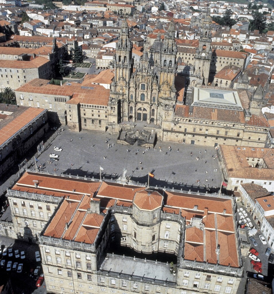 Vista aérea de la Plaza del Obradoiro. En primer término, el Palacio Rajoy, Ayuntamiento de Santiago, a la izquierda de la imagen, el Hostal de los Reyes Católicos, hoy Parador de Turismo, y en frente, la Catedral de Santiago.