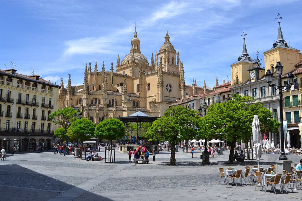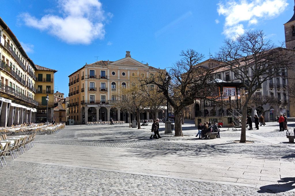 Plaza Mayor de Segovia. Al fondo el Ayuntamiento, a la derecha se puede ver la torre de la Iglesia de San Miguel. En el centro de la plaza, un templete para música.