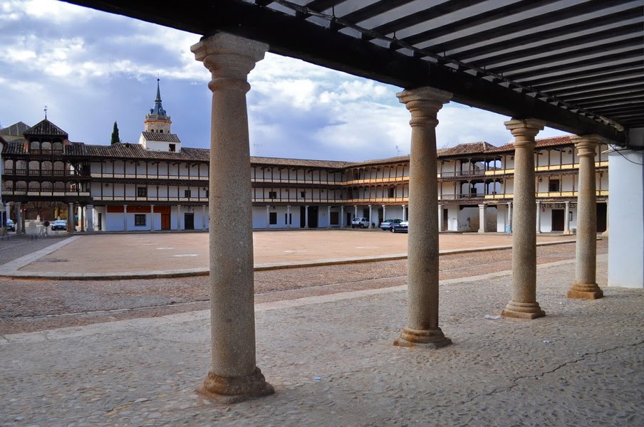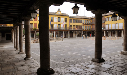 Plaza Mayor de Tordesillas. El Ayuntamiento enfrente. Su aspecto es el mismo que en los siglos XVI y XVII. Con columnas de estilo toscano que sujetan las zapatas y las vigas de madera. En el primer fin de semana de octubre se celebra un mercado medieval muy concurrido.