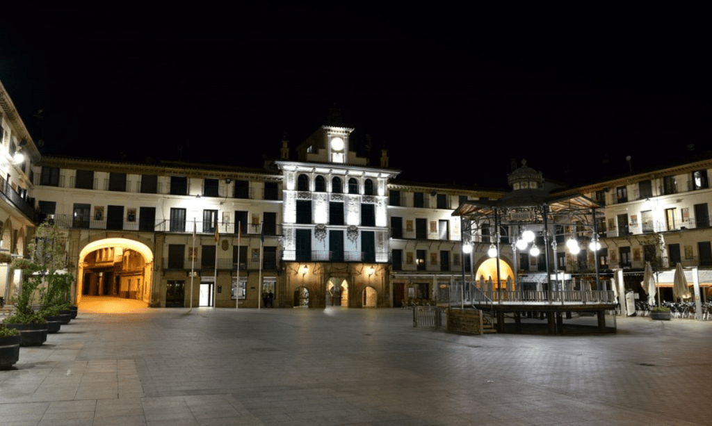Vista de la Plaza de los Fueros iluminada. Por los pasadizos, algunos de Rafael Moneo, se sale al la judería de la ciudad.