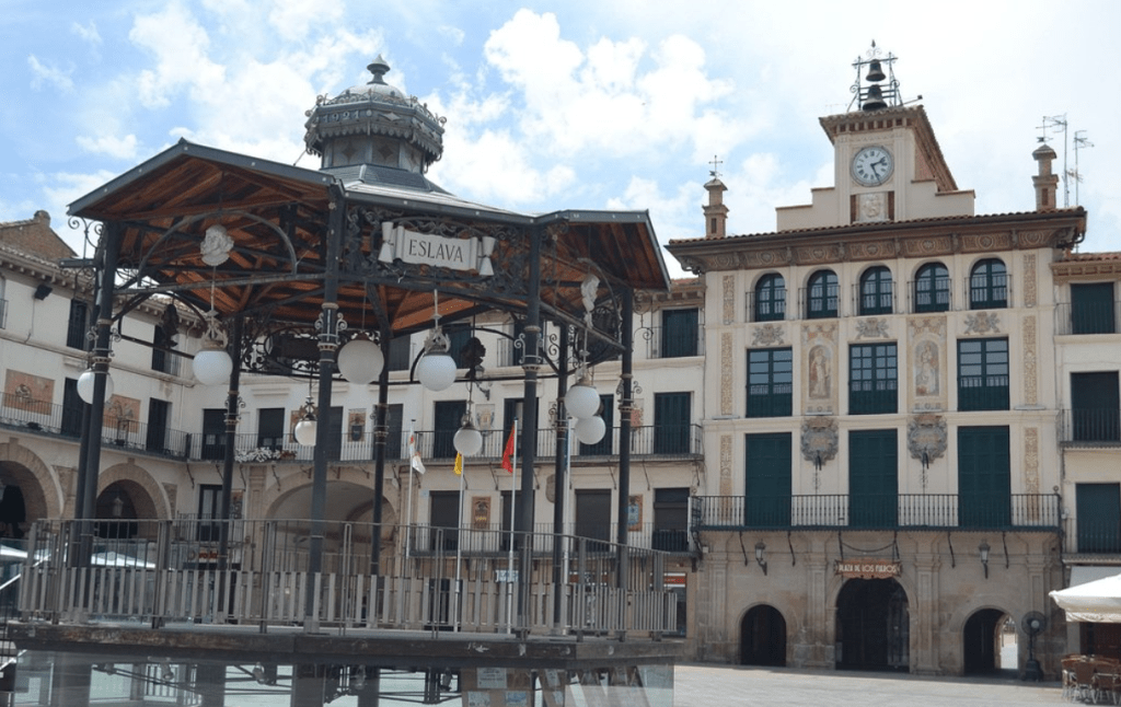 A la derecha, la Casa Heredia. Enfrente a la izquierda la Casa del Barón de la Conca. En el centro, el Ayuntamiento.