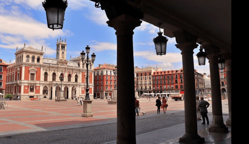 Plaza Mayor de Valladolid, una de las más grandes de España. Antiguamente tenía jardines centrales, luego se quitaron para construir el aparcamiento como en Madrid.