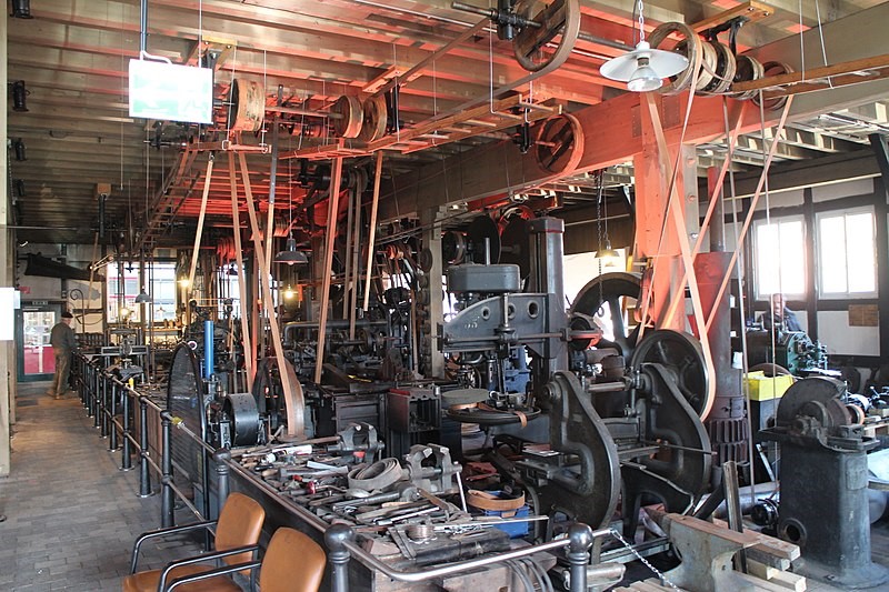 Hasta en la cafetería del museo se pueden ver máquinas, como la de un reloj.