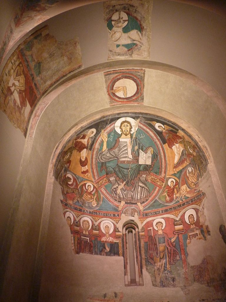 Pinturas al fresco originales de San Clemente de Tahull, hoy en el Museo de Arte de Cataluña. El Maestro de Tahull representa al Pantócrator, Cristo en Majestad, enmarcado en una mandorla, representación de la gloria celestial, rodeado por los tetramorfos y en actitud de bendición, con el Libro de la Vida y la Sabiduría en su mano izquierda, abierto, con la inscripción Yo soy la luz del mundo. Bendice con la mano derecha y a sus lados las letras Alfa y Omega. Bajo Él, y en tamaño más pequeño, se encuentran la Virgen y los apóstoles, quizá realizados por otro maestro.