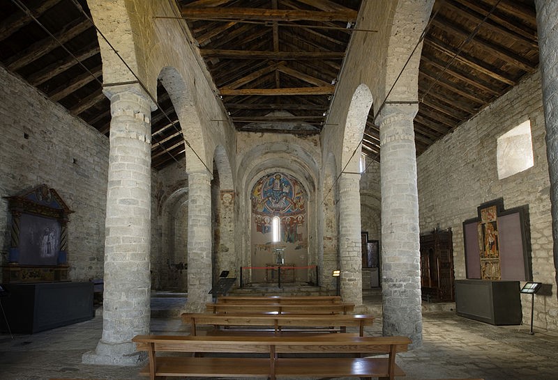 Interior de Santa María de Tahull. Tiene planta basilical con tres naves, separadas por gruesos pilares circulares, sin capitel y terminadas en sendos ábsides. En el siglo XVIII , las dos naves laterales fueron reestructuradas para colocar en ellas otras capillas, y la nave central fue recubierta con una bóveda de cañón. A principios del siglo XX, se volvió a la estructura original con cubiertas de madera a dos aguas y protegidas con pizarra al exterior.
