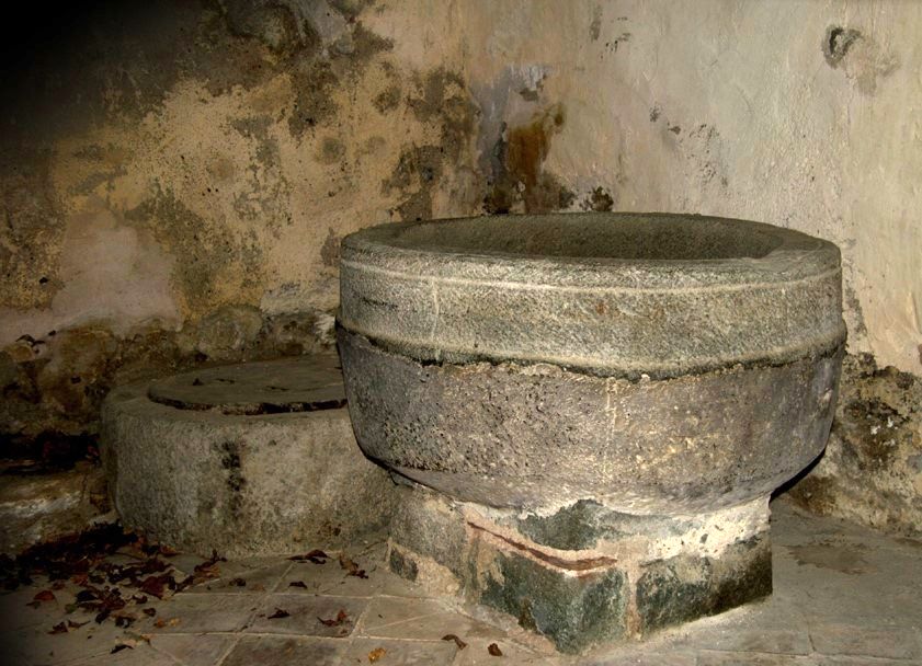 Tiene tres pilas románicas. La pila bautismal, en la imagen, otra pila de agua bendita, sobre un pedestal delgado y alto y una pila para el aceite.