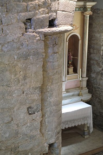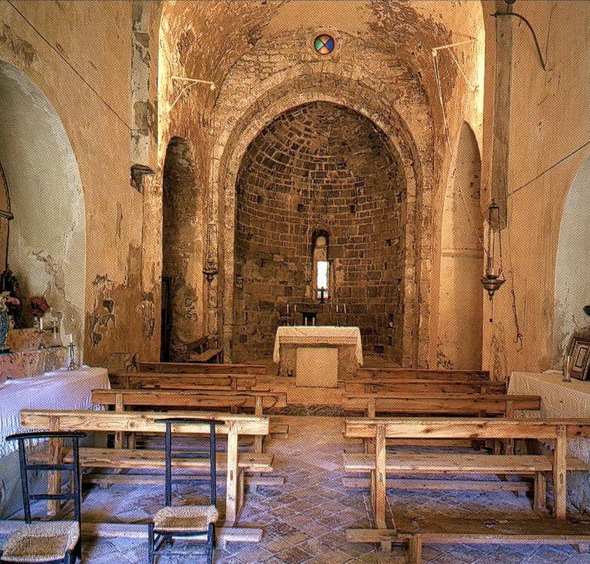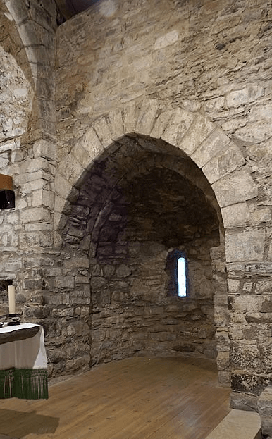Uno de los absidiolos, con arco apuntado. Al otro lado, hay otro absidiolo similar, pero con arco de medio punto. El interior resulta bastante oscuro, ya que la luz natural tan sólo penetra por unas pequeñas ventanas situadas en los muros, además de una, de reducidas dimensiones, en cada absidiolo lateral.