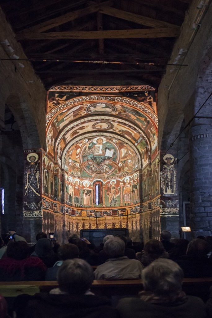 Proyección de un video mapping que muestra las pinturas del ábside mayor, exponiendo cómo era la iglesia en el siglo XII, siguiendo unos esquemas con una simetría casi perfecta, que representa la perfección de Dios. Los pliegues de los ropajes son muy esquemáticos, todo sin ninguna profundidad , resaltados por una línea negra y gruesa, con brillantes colores, que llaman la atención de los fieles y les transmite la sensación de autoridad y gloria que emana de Cristo.
