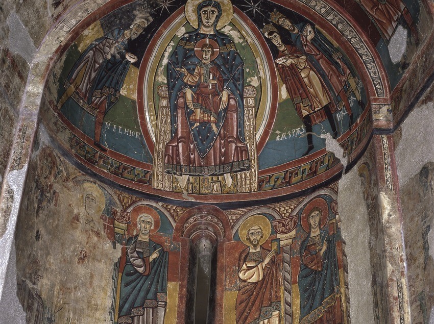Las pinturas al fresco del ábside de esta iglesia fueron trasladas al Museo de Arte de Cataluña (MNAC), y en su lugar se instaló una copia. Se aprecia alargamiento de las figuras y estilización de los rasgos faciales. Aparece la Virgen como trono de Dios, rodeada de los Reyes Magos con sus ofrendas, Gaspar y Baltasar a su izquierda y Melchor en la derecha, identificados cada uno por las cartelas que hallamos a sus pies. Debajo, las figuras de los cuatro evangelistas. Los fondos, también en vivos colores. La frontalidad de las figuras y la dureza de los plegados son dos características de la pintura románica.