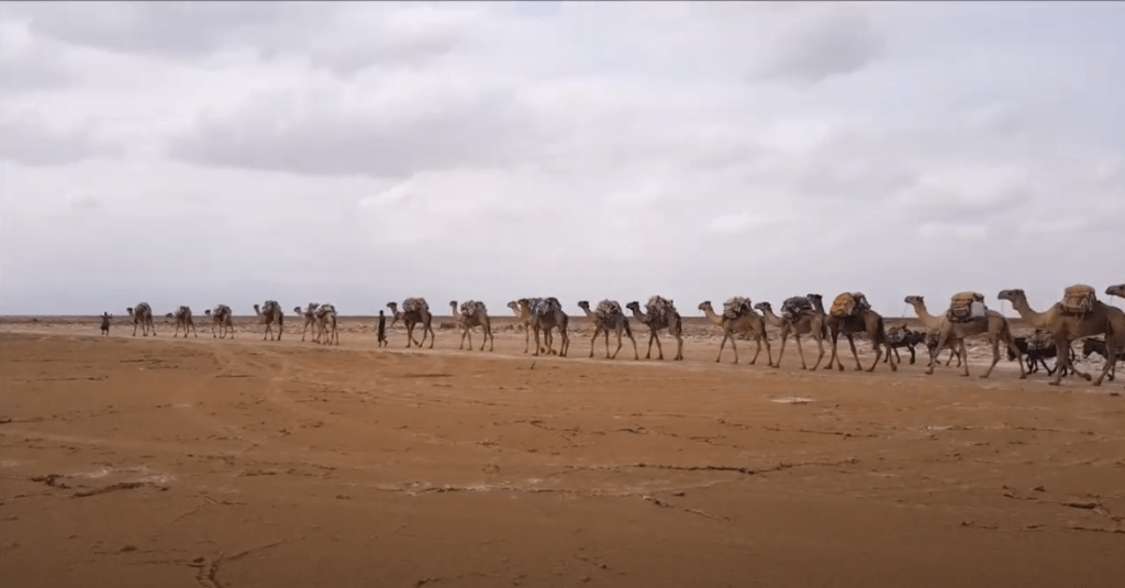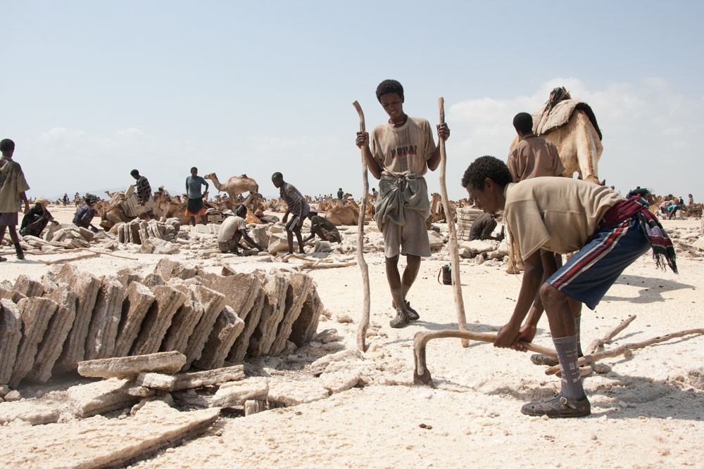 La principal actividad económica del pueblo afar es la extracción de sal, que aún se corta a mano en losetas y se carga en dromedarios para su transporte. Son autónomos, es decir, que cada uno trabaja para sí mismo. Es habitual ver caravanas de estos animales hacia Tigray, por antiguos senderos haciendo un lento viaje. Se pagaba a buenos precios.