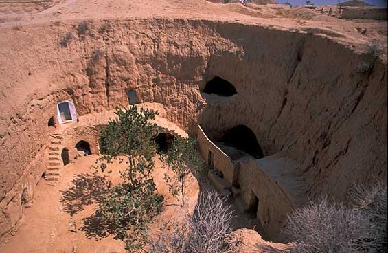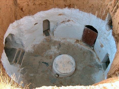 Un patio, enterrado a 8 metros de profundidad y 10 x 10 metros de área, permite organizar viviendas alrededor. Los patios subterráneos crean un microclima de sombra que hace más soportable el calor del Sahara. Además, tienen protección contra las tormentas de arena.