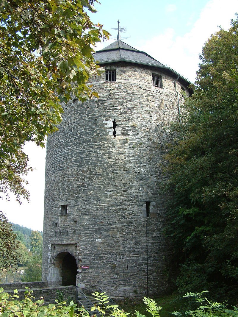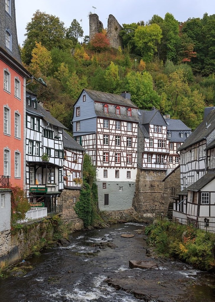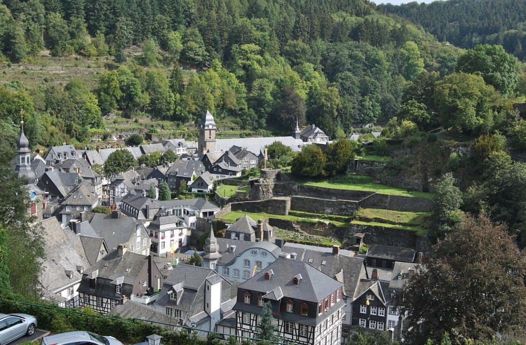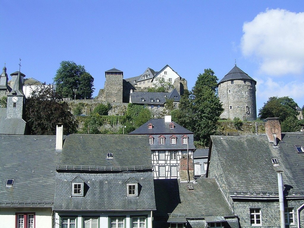 La población está dominada por el Castillo Medieval de Monschau, situado en alto, del que solo se conserva parte.