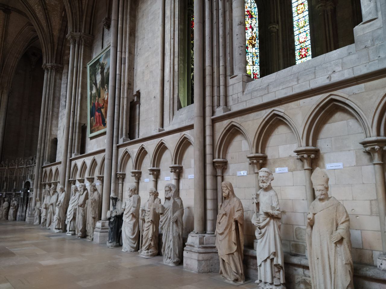 Estatuas que estaban en la fachada de la catedral y ahora en el deambulatorio. En el centro, nave lateral. Derecha capilla con imagen de la Piedad.
